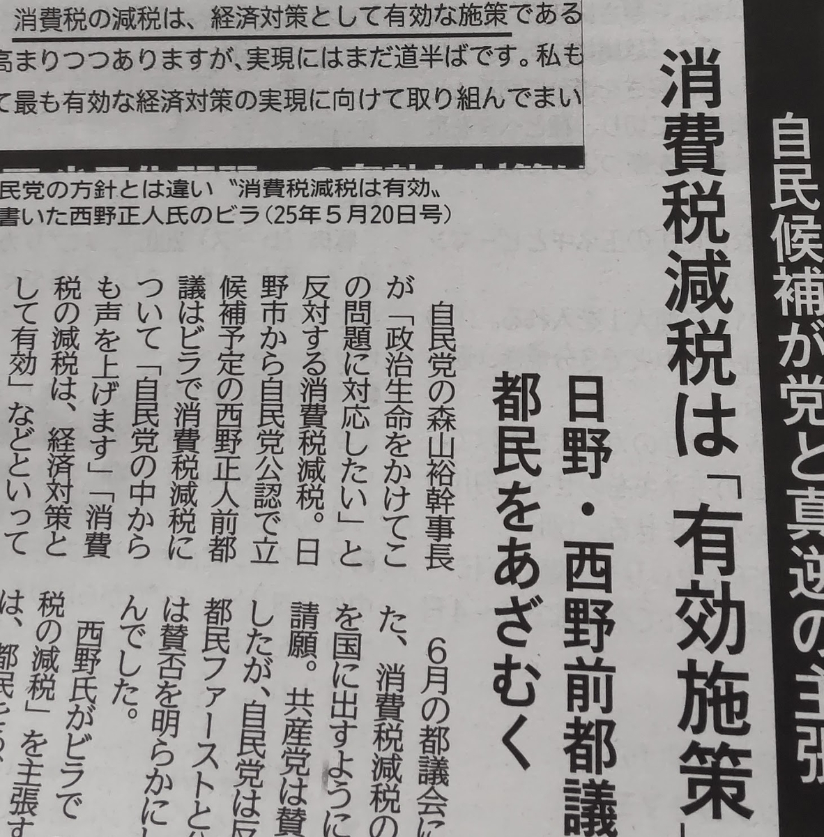 …岸田文雄前首相は八王子市で行った(都議選の応援)演説で、消費税減税を求める世論の高まりに背を向け、「減税も1年とか2年とか、食料品に限るとか、さらには財源も明らかにしないなら、政策に打ち出した後、先はどうなるのか全く見えない」とけん制(しんぶん赤旗14日付)