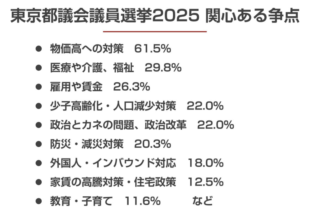 実際、世論調査でも「物価高騰対策」は非常に関心が高いのに、「雇用・賃金」「家賃の高騰対策・住宅政策」として分けられて聞かれると、順位が低くなってしまっています(下図、選挙ドットコムより)。