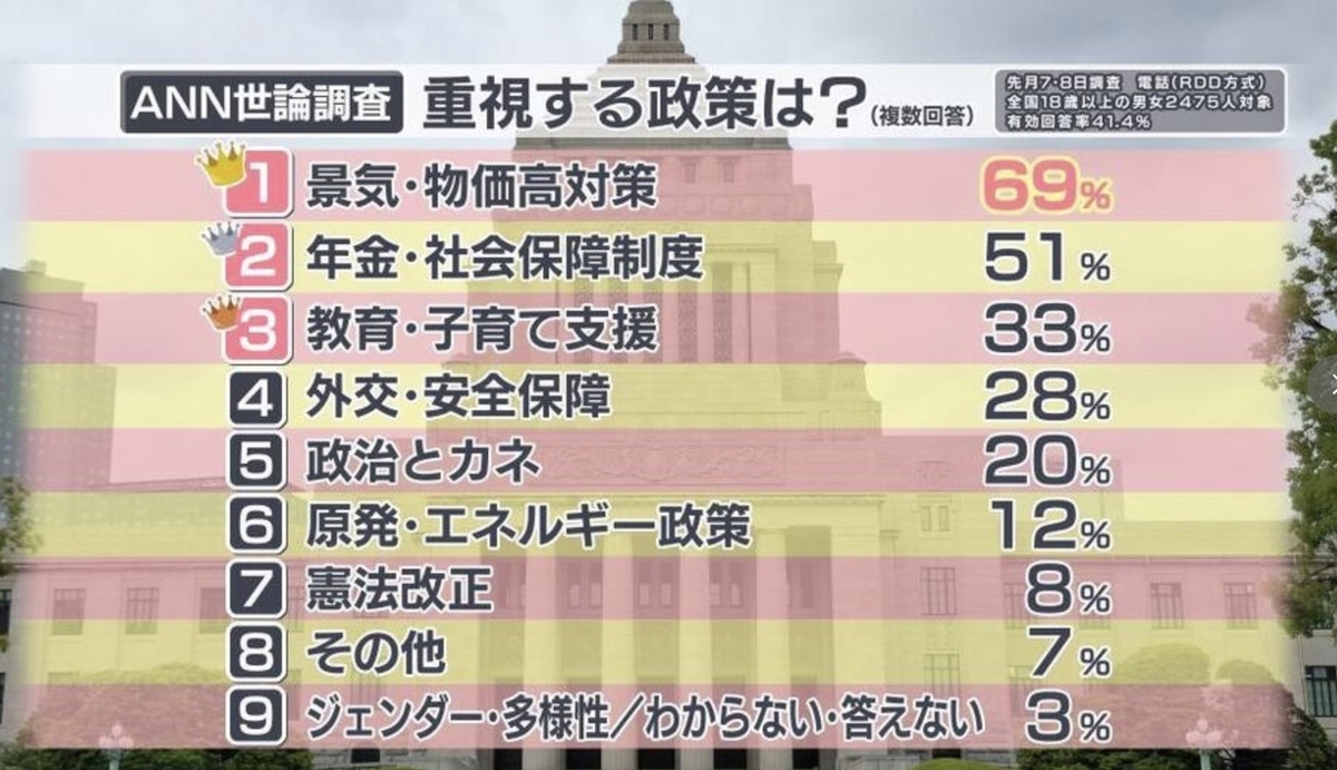 まず物価高騰対策の消費税減税が非常に大きく取り上げられていること。後述しますが、参院選で非常に関心が高いテーマです。